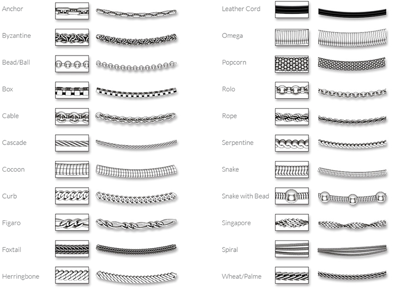 Chains are a series of connected metal links or loops with an attached-clasp assembly. There are several variations of chains, and the most popular are omega, rope, and box chain styles. When purchasing a diamond pendant, the chain is included. Typically, a fine jeweler will include the chain in the same metal type as the pendant.