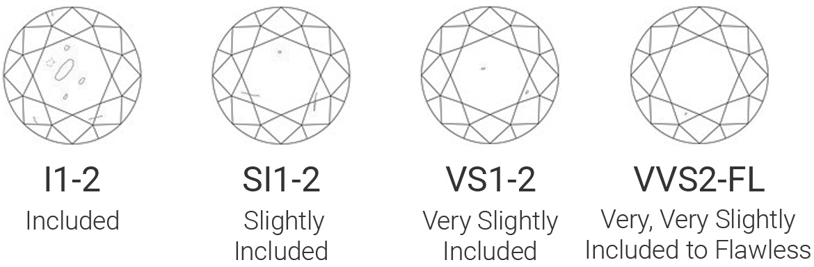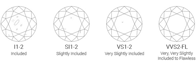 VVS1-VVS2 SI1-SI2 - Slightly Included | Very, Very Slightly Included: Contains minute inclusions that are extremely difficult for an experienced grader to locate under 10x magnification. I1 - Included |