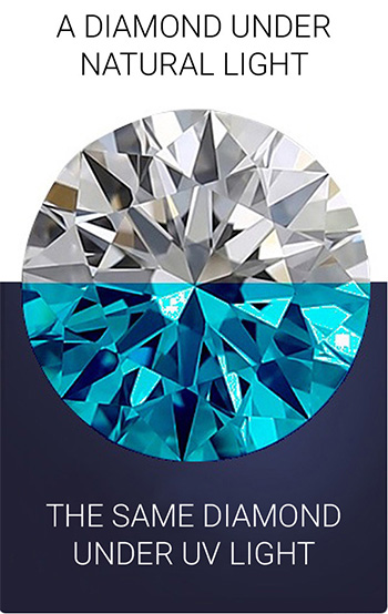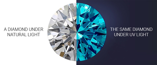 The fluorescence of a diamond is the visible glow that occurs when it is exposed to ultraviolet (UV) light. Fluorescence is a naturally occurring phenomenon created from the mineral properties boron and nitrogen. It can appear in many minerals and gems.