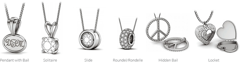 Two of the most popular categories are pendants and necklaces. A diamond necklace is constructed with gold or platinum links and set with diamonds either partially or all the way around the neckline. A pendant is an adornment designed to be suspended from either a chain or cord. A pendant features a bail style, which is an arched (often oval, teardrop, or d-shaped) metal component by which the pendant hangs. It is meant to slide onto the chain rather than being soldered to it so that the pendant moves independently from the chain and is not a permanent part of the chain or cord.