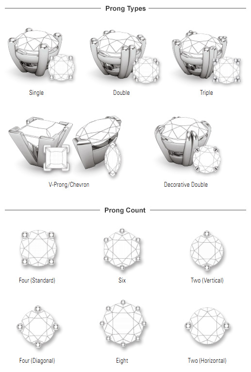 Settings are not only meant to secure diamonds in place, but also add visual appeal. For example, a classic prong setting minimizes the appearance of metal so you see more of the diamond. Other settings are specially designed to create dramatic effect by creating an ‘illusion’ that a diamond is larger, and there are also setting types that reflect more light. Learn more about the top setting types here: