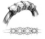 A common shared prong setting is a variation of the traditional prong setting in which the prongs are wrapped around the crown of more than one stone. This type of setting minimizes the appearance and presence of metal and allows additional light to pass through a diamond or gemstone.